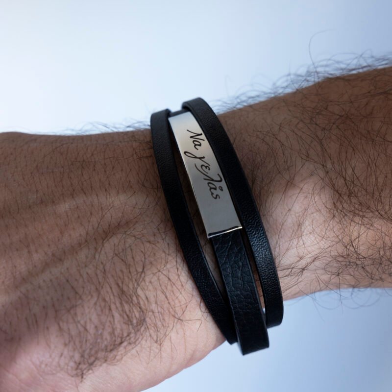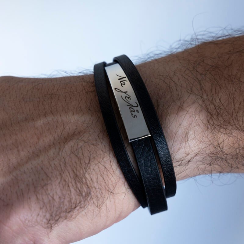 Μαύρο δέρμα που αγκαλιάζει τον καρπό σε τρεις λεπτές λωρίδες και μεταλλική πλακέτα με χάραξη «Να γελάς»,μια διακριτική υπενθύμιση στάση ζωής.